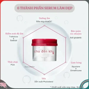 Những thành phần chính bao gồm: The Royal Jelly EX, Trehalos and Sorbitol, PCA, Fitosterol, Lipidure EX, Squalane and Dimetikon, Glutamine.